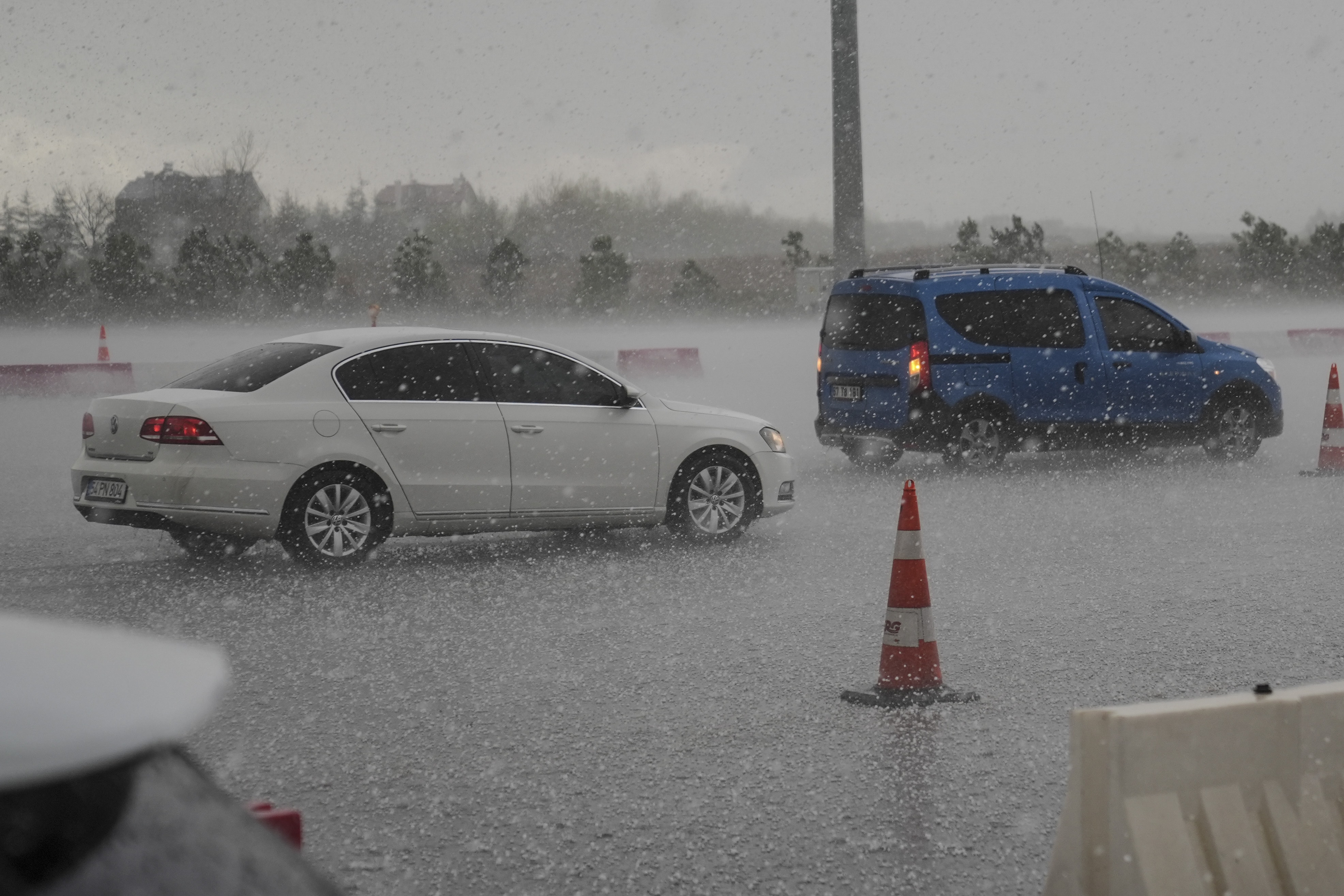 Otoyolda dolu yağışının yoğunlaştığı alanlar beyaza büründü.