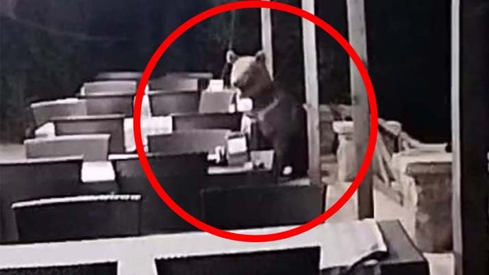 Aç kaldığı için ormandan restoran bahçesine geldiği düşünülen ayı, masalarda yemek aradı.