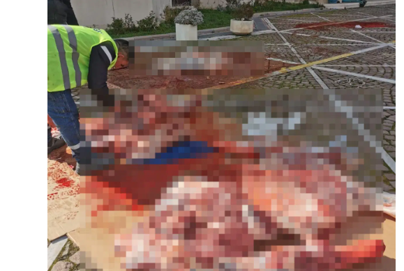 Önümüzdeki günlerde iş makineleriyle yıkımına başlanacak olan binanın önünde çalışanlar tarafından kurban kesildiği görüldü.