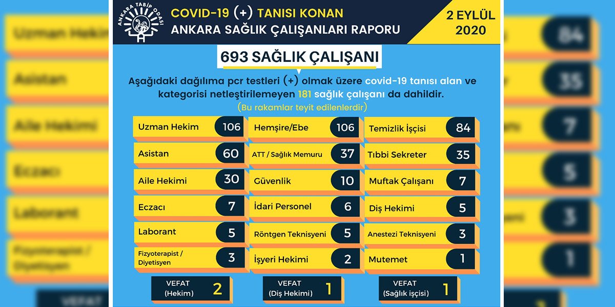 "02 Eylül 2020 tarihi itibariyle, Ankara Tabip Odası Yönetim Kurulu tarafından ulaşılan ve teyit edilen Covid-19 (+) tanısı alan sağlık çalışanlarının sayısının 693'e yükseldiği bildirildi".