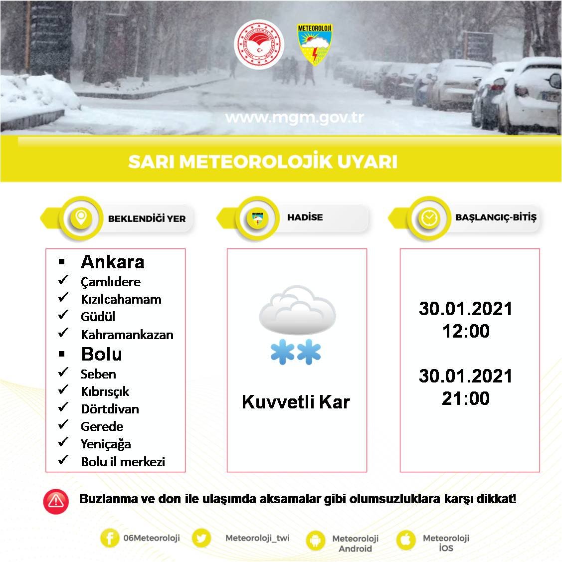 Meteoroloji Genel Müdürlüğü, yarın(Cumartesi) öğleden itibaren Ankara’nın kuzeyi (Çamlıdere, Kızılcahamam, Güdül, Kahramankazan) ile Bolu’nun güneydoğusunda (Seben, Kıbrısçık, Dörtdivan, Gerede, Yeniçağa ve Bolu il merkezi) yoğun kar yağışı bekleniyor.