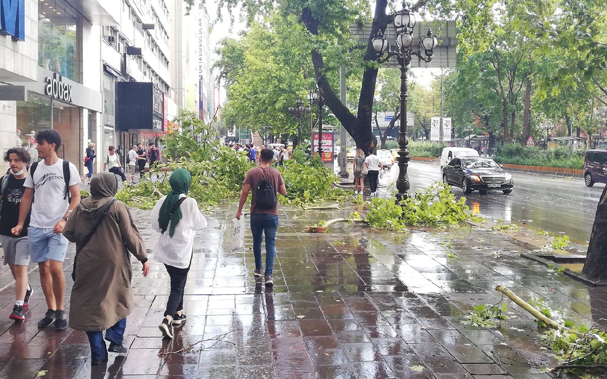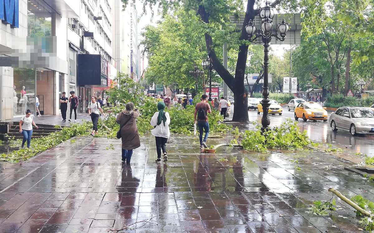 Yaklaşık 20 dakika süren fırtına ve sağanak yağmur, Kızılay semtinde ağaçların devrilmesine neden oldu.