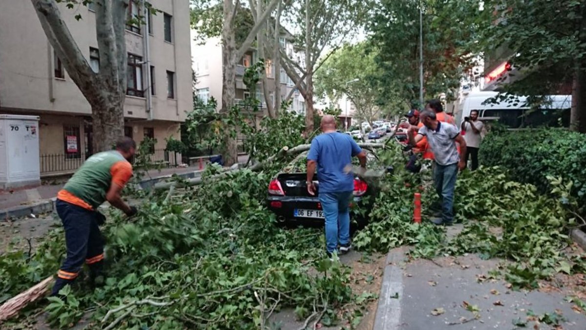 Devrilen ağaçların bulunduğu yerde park halinde olan otomobillerde hasar meydana geldi.