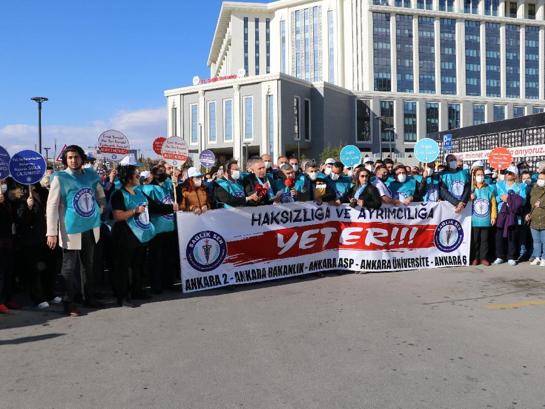 Ankara'da Sağlık-Sen üyesi sağlık çalışanları, hekimlere yönelik zam düzenlemesinin tüm sağlıkçılara uygulanmasına isteyerek iş bırakma eylemi gerçekleştirdi.