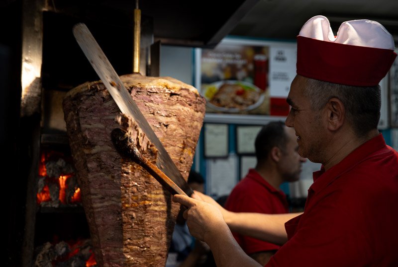 Döner ustası Selim Koçaker, "Sıcaklıkların zorlukları var ama mecbur işimizi yapmak durumundayız. Bu senenin en sıcak günü, çalışmamızı zorlaştırıyor. Dükkanın içindeki sıcaklık şu an 50 derece vardır." dedi.