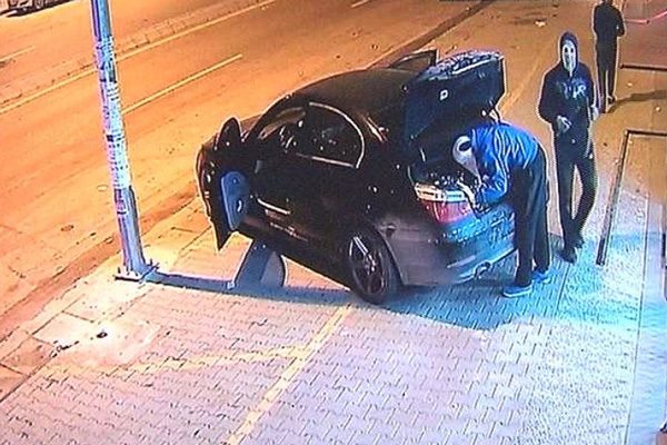 Bu sırada caddeden bir aracın geçtiğini gören zanlılar, otomobillerine binerek saklandı. Tekrar dışarı çıkan ve kapının demir korkulukların kilidini kıran zanlılar, caddeden bir araç geçmesi üzerine bu defa eğilerek saklandı. Arka arkaya geçen araçların ardından levyeyle otomatik kapıyı aralayan zanlılardan biri üst üste tekme atarak kapıyı kırdı.