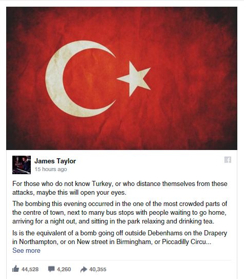 Ankara'da yaşayan müzisyen James Taylor'ın Facebook hesabından paylaştığı "Charlie oldunuz, Paris oldunuz, peki Ankara olacak mısınız?" sorusu ile biten yazı, dünya kamuoyuna büyük bir ders verdi.