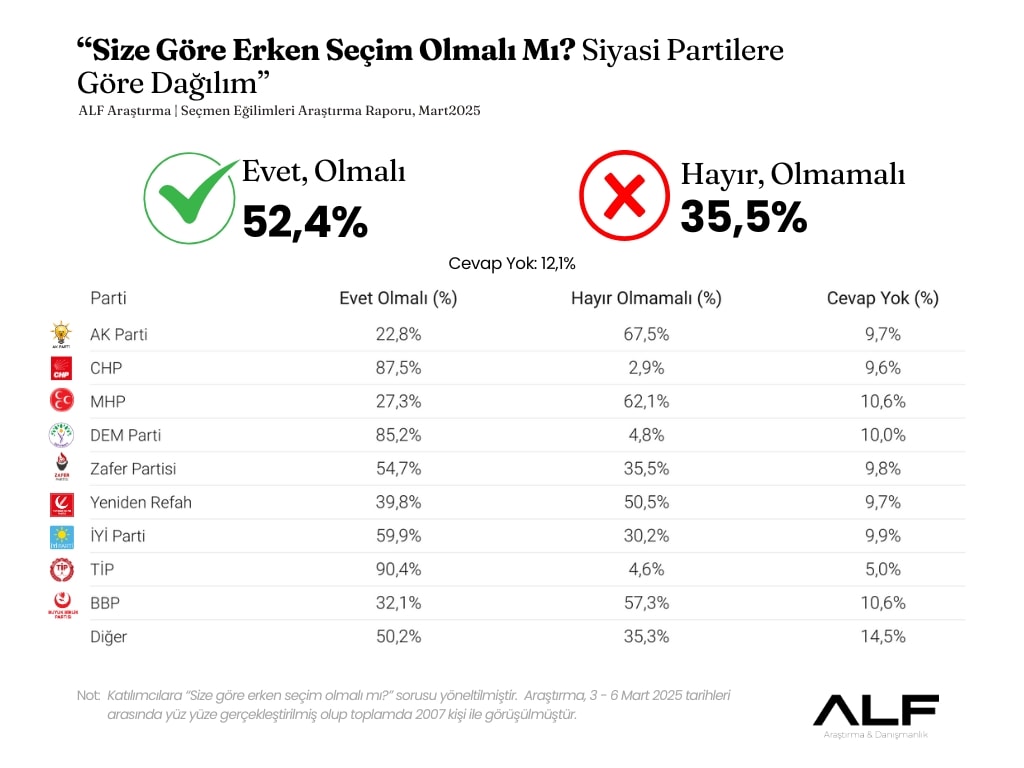Katılımcılara “Size göre erken seçim olmalı mı?" sorusu yöneltilirken; sonuçlar siyasi partilere göre sıralandı.