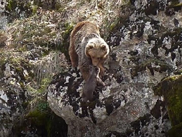 Önde giden anne boz ayının ara ara dönüp yavrusunu yoklaması ve zorlu yerlerde yavrusunu ağzıyla taşıması dikkat çekti. (İHA)