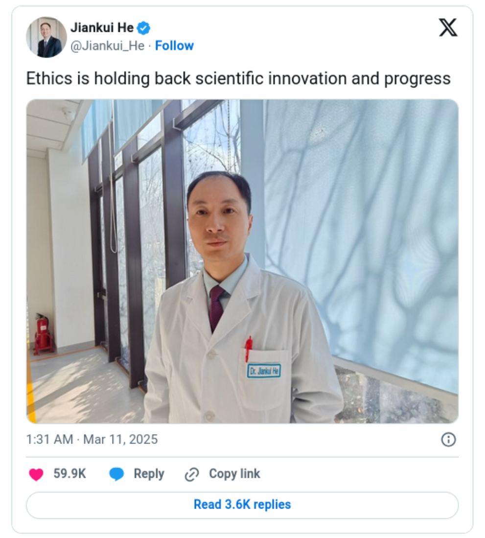 Dünya için muamma olan çılgın doktorun en son X paylaşımlarından biri ise dikkat çekti. Beyaz önlüğüyle poz veren He Jiankui paylaşımında "Etik kuralları, bilim ilerlemesi önünde bir engel" diye yazdı.