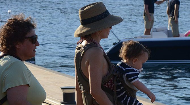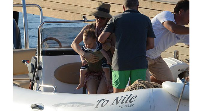 Göcek'in ardından kendi tekneleri ile Bodrum'a gelen Nil Karaibrahimgil, oğlu ile Mandarin Otel'deydi. Eşinin tekneye giderken almaya geldiği Nil Karaibrahimgil, oğlunu kangru ile taşırken objektiflere yansıdı.