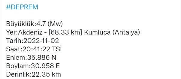 Antalya Kumluca ilçesinin 68.33 kilometre açığında saat 20.41de kaydedilen deprem, 22.35 kilometre derinlikte meydana geldi.