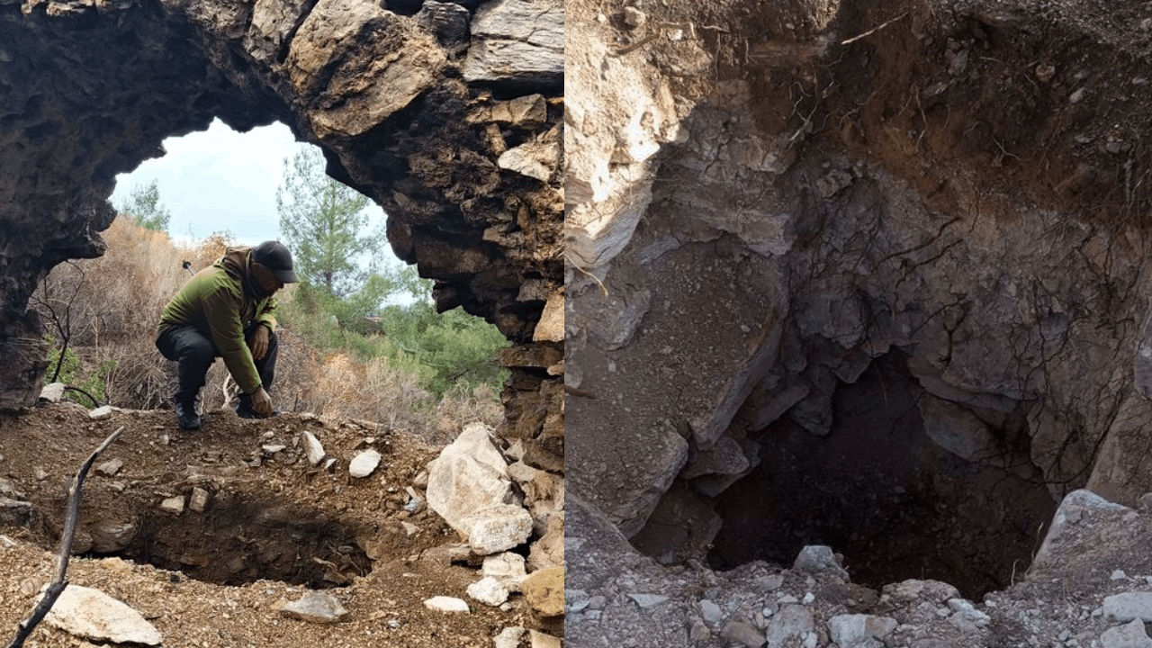 Baca sistemlerinin içine, ağaç dallarından hazırladıkları düzeneklere bağladıkları iplerle inen defineciler tonlarca toprağı yüzeye çıkararak kaçak kazı yapmışlar.