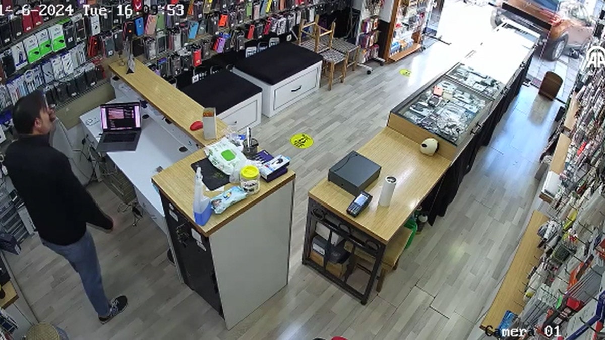 Görüntüde, otomobilin geri gelerek hızla iş yerine girmesi ve içerdeki kişinin çarpmanın etkisiyle sürüklenen satış tezgahının arkasında sıkışması yer alıyor.