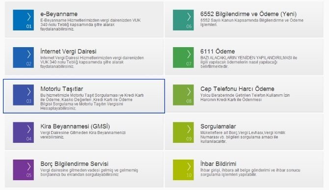 Motorlu taşıtlar seçeneği sonrasında açılan formun doldurulması ile birlikte kişilerin araç bilgilerini görmesi mümkün olur. Bu seçenekte kişiler motorlu taşıtlar vergisi için işlem yapabilir. Menüde yer alan motorlu taşıtlar vergisi seçeneğinin seçilmesi yeterli olur. Seçim yapılabilen ekran ise şöyledir;