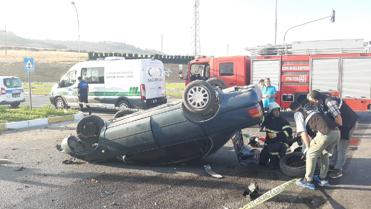 Çorum'da Can Keser (25) idaresindeki 19 TP 492 plakalı otomobil Samsun-Ankara kara yolu Çorum Burunçiftlik Kavşağı'nda sinyalizasyon direğine çarparak takla attı.