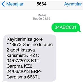 Araç tramer kaydı sorgulama yapmak isteyenlerin cep telefonlarının mesaj bölümünü kullanması ve araç plakasını yazarak 5664’e göndermesi yeterli olmaktadır. Bu şekilde yapılacak işlemler sonucunda kişiler kolay bir şekilde tramer kaydı sorgulama yaparak, kaza bilgilerine erişim sağlayabilecektir. Araç sorgulama sonucunda kişilere gönderilecek kaza bilgileri resmi kayıtlar üzerinden sağlandığı için alınacak bilgiler güvenilirdir. Bu bakımdan araç tramer kaydı sorgulama yapacak kişiler araçların yaptığı kazalar hakkında net bilgilere ulaşarak kolay bir şekilde bilgi sağlayabilmektedir. Gib.gen.tr sitesinde yer alan araç hasar kaydı sorgulama yazısındaki belirtildiği gibi örnek bir sorgulama şöyledir: