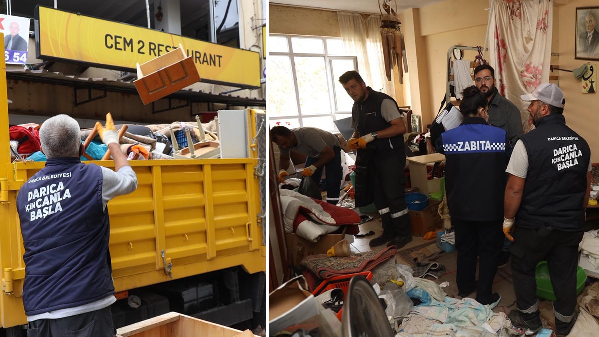 Kocaeli’nin Darıca ilçesinde kötü koku nedeniyle ihbar edilen bir evden belediye ekipleri tarafından 2 kamyon dolusu çöp çıkarıldı.