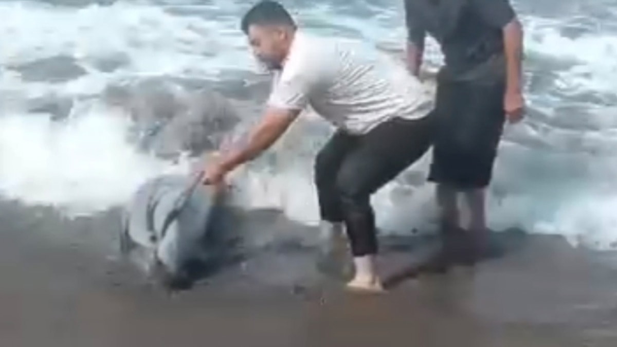 Hatay'ın Samandağ ilçesinde sahile vuran yunus, çevredekilerin çabasıyla tekrar denize bırakıldı.