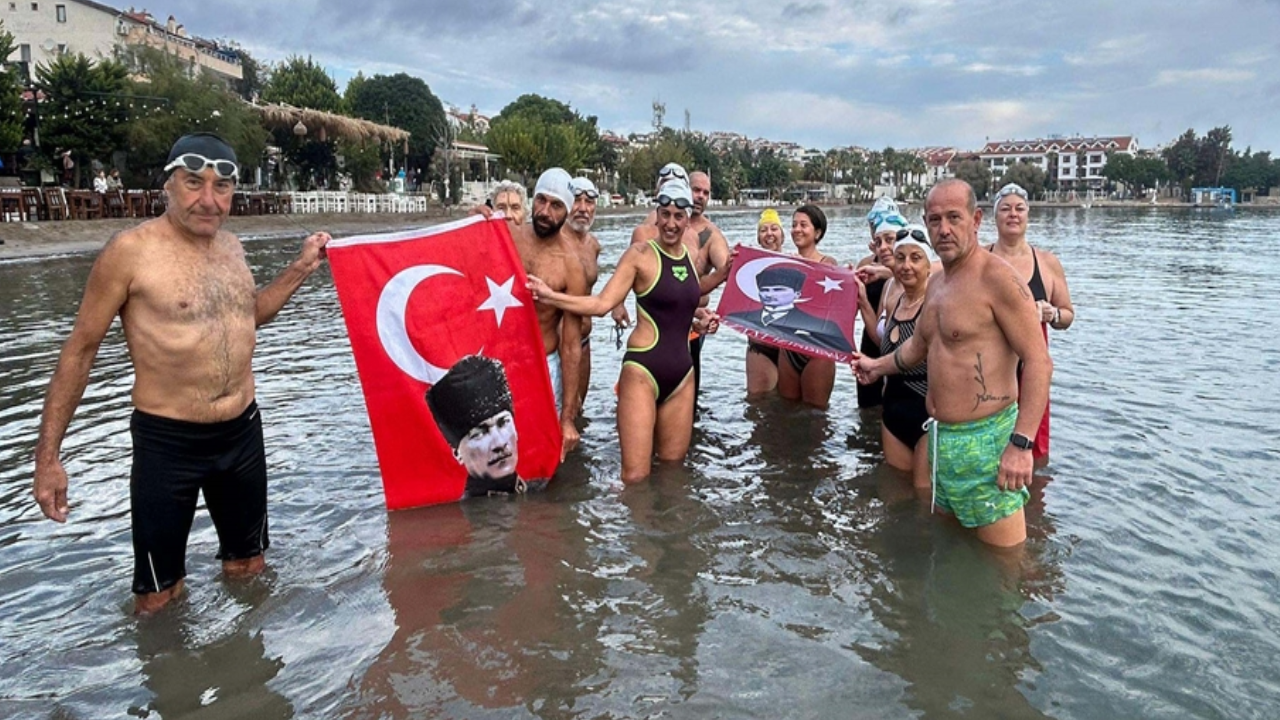 Muğla’nın Datça ilçesinde, açık deniz yüzme sporcuları 10 Kasım Atatürk’ü Anma Günü kapsamında 09.05’te denizde saygı duruşunda bulunup, 'Bir Çift Mavi Gözün Işığında' sloganıyla kulaç attı.