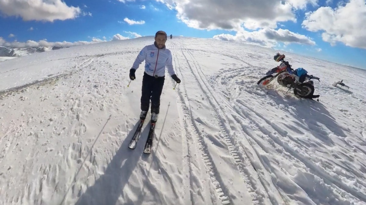 Erzincan Ergan Dağı Kayak Merkezi'nde, son günlerde yoğun kar yağışı yaşandı. Kayak antrenörü Canser Atila ve arkadaşı Recep Sulu, motosikletleriyle zirveye ulaşıp, sezonun ilk kayağını yaptı.