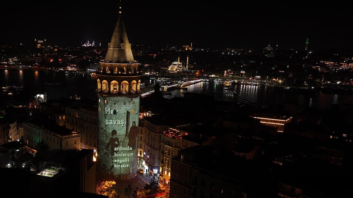 Galata Kulesi'ne savaşlarda engelli kalan çocuklar ve sivillerin videosu yansıtıldı
