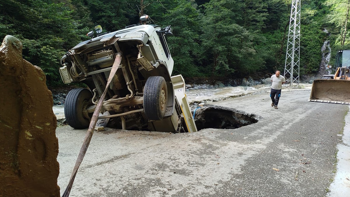 Artvin'in Arhavi ilçesinde heyelan nedeniyle kapanan yolda yapılan onarım çalışmaları sırasında çökme sonucu oluşan çukura düşen kamyonun sürücüsü yaralandı.
