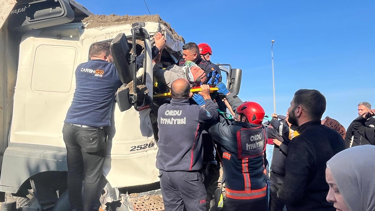Ordu’nun Ünye ilçesinde bir kamyonun TIR’a arkadan çarpması sonucu araç içinde sıkışan sürücü Adem Erek (51), itfaiye ekiplerinin çalışmasıyla kurtarıldı.