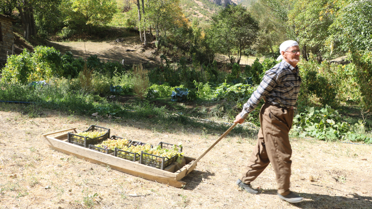 Hakkari'nin Şemdinli ilçesinde geçimini üzüm üreterek sağlayan Süso Çakar (80), hasat ettiği üzümleri geleneksel yöntemle kızakla kilometrelerce taşıyarak köyüne indiriyor. Çakar, tek geçim kaynağı olan bu işi severek yapmanın mutluğunu yaşadığını söyledi.