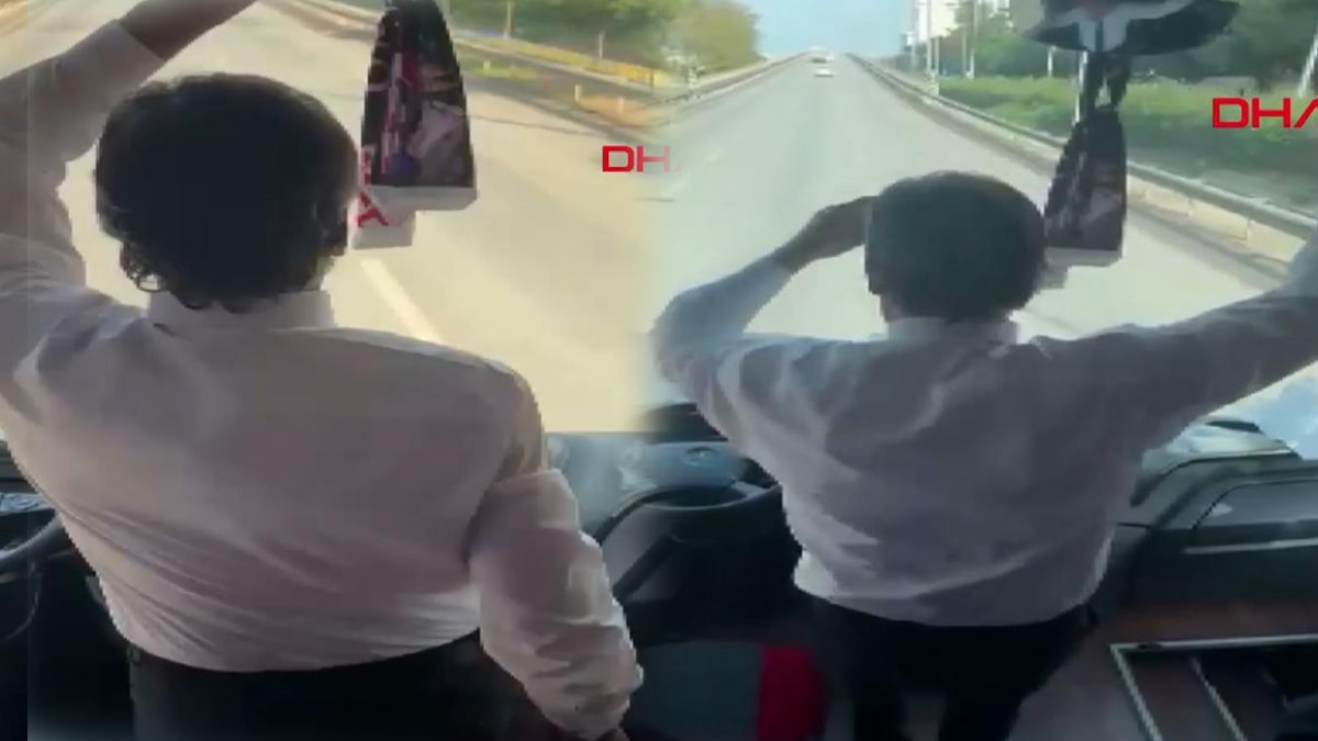 Antalyaspor taraftarını Konya'da oynanacak maç için taşıyan otobüsün şoförünün seyir sırasında koltuğundan kalkarak oynadığı görüntüler, tepkilere neden oldu.