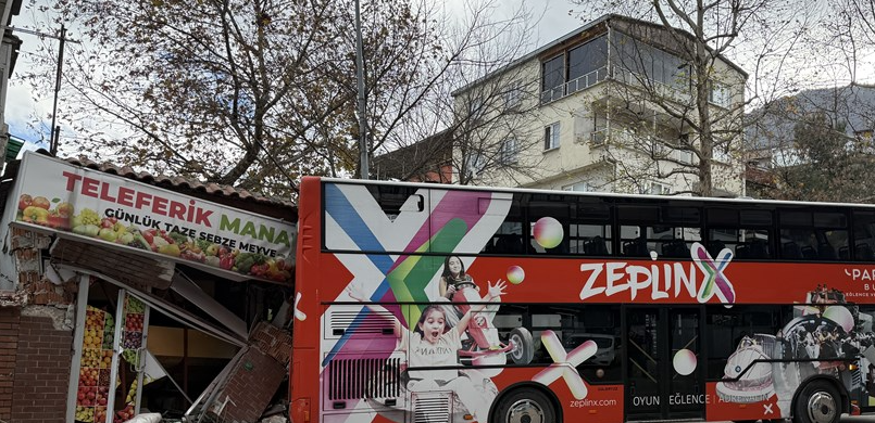 Bursa Yıldırım’da park halindeki tur otobüsü bilinmeyen nedenle geri giderek otomobile ve manava çarptı. Yaralananın olmadığı olayda maddi hasar meydana geldi.
