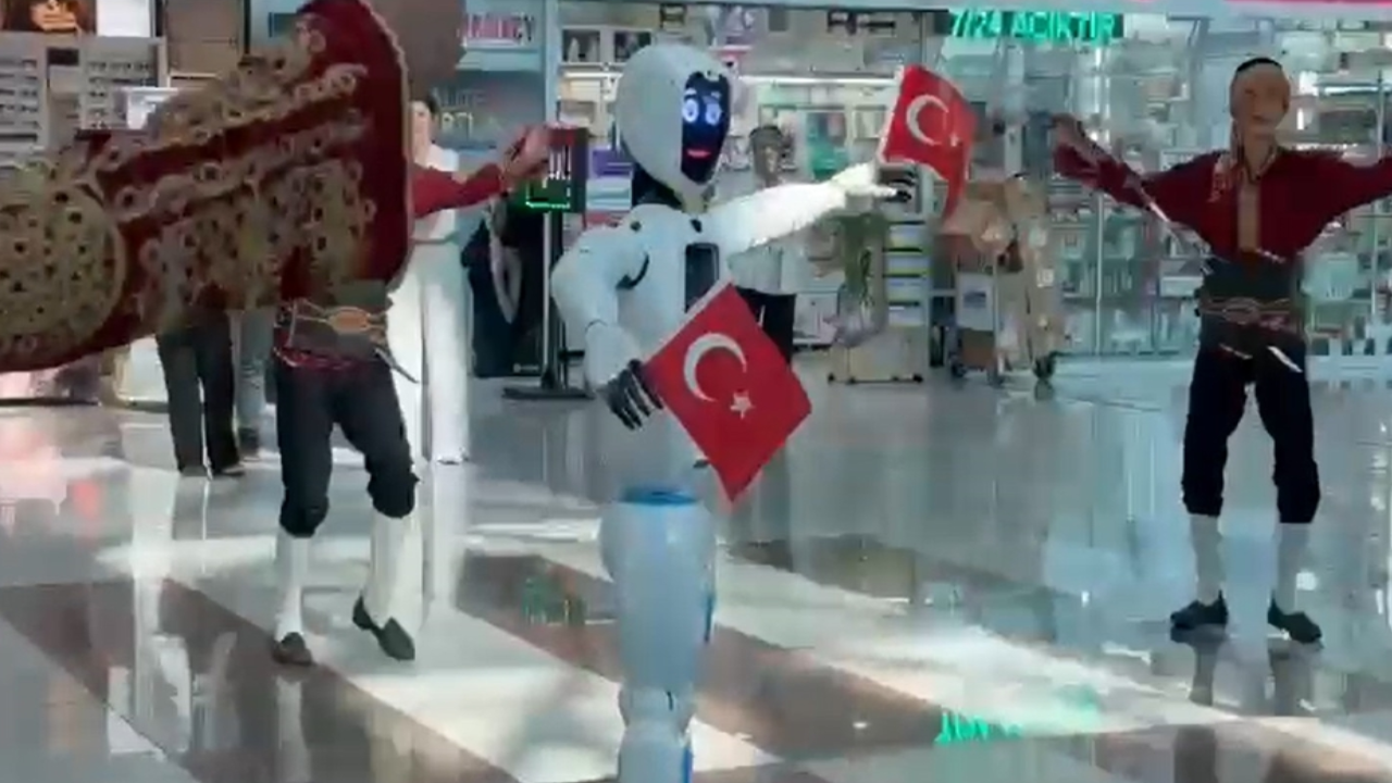 Ankara Esenboğa Havalimanı’nda yolcu refakat robotunun, geleneksel kıyafetler giymiş seymenlerle uyum içinde dans etmesi yolculardan ilgi gördü.