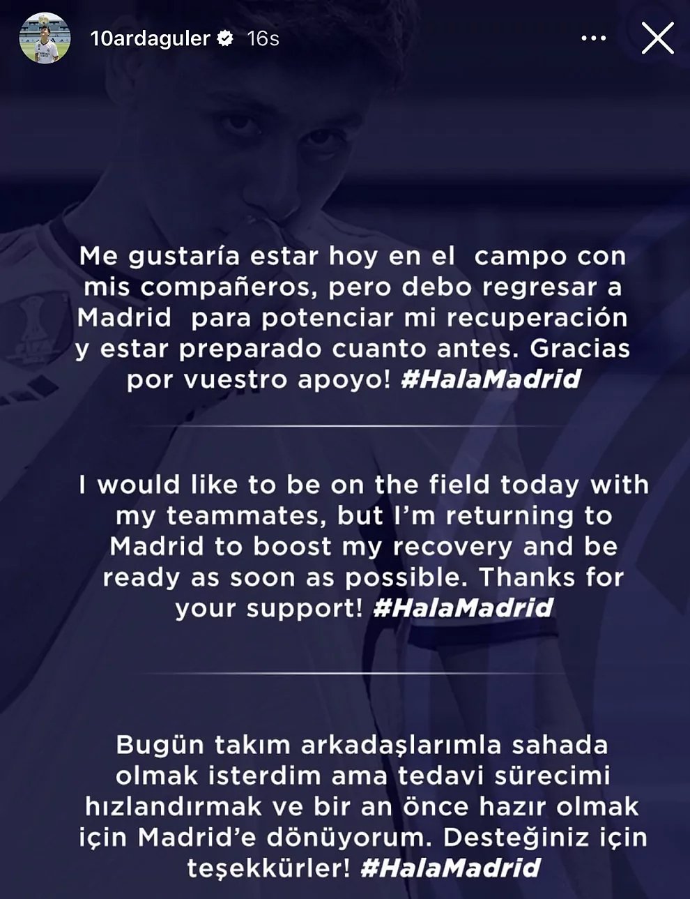 Genç futbolcu, taraftarlarına sosyal medya hesaplarından şu mesajı iletti: "Bugün sahada olmayı çok isterdim, ancak Madrid'e geri dönmem ve en kısa sürede hazır olmam gerekiyor. Destekleriniz için teşekkür ederim! ¡Hala Madrid!"