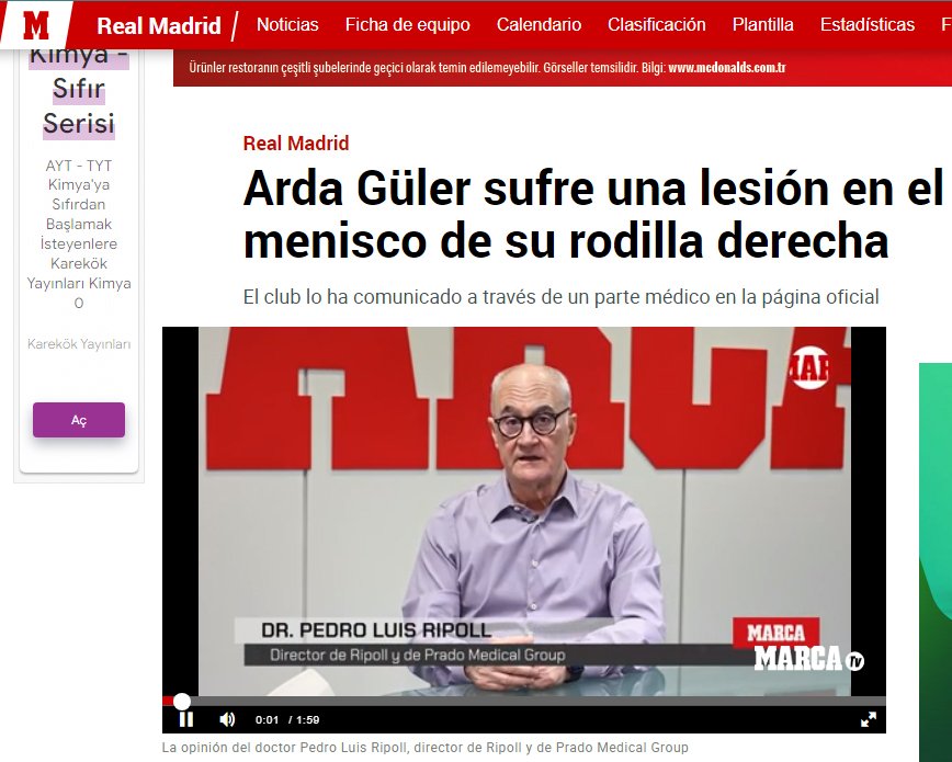 Öte yandan, İspanya'nın en ünlü doktorlarından ve sporcu yaralanmaları konusunda uzman olan Pedro Luis Ripoll, Arda Güler'in sakatlığına ilişkin açıklamalar yaptı. Marca'ya konuşan Ripoll, Arda Güler'in sakatlığına dair teşhis konulduktan sonra olası tedavileri ve iyileşme sürecine ilişkin şu sözleri söyledi: