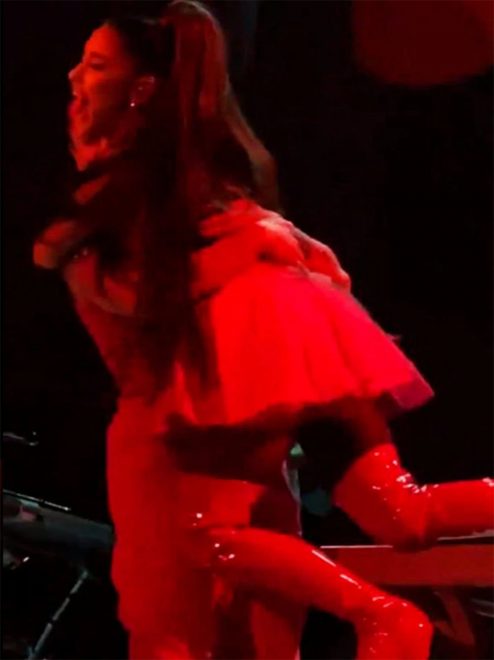 Grande'yi dansçıyı yakaladı.Bad Idea şarkısını söylediği sırada yüksek topuklu ayakkabılarıyla bir platformun üzerinde yürüyen ünlü şarkıcı, dengesini kaybederek bir anda dizlerinin üzerine düştü.
