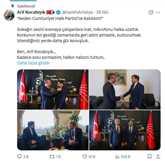 Sosyal medyada röportajlarıyla bilinen "İlave TV" kanalının sahibi Arif Kocabıyık, siyasi yolculuğunu CHP bünyesinde sürdüreceğini açıklamıştı.
