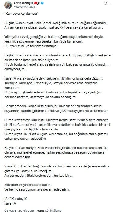 "Bugün, Cumhuriyet Halk Partisi üyeliğimin durdurulduğunu öğrendim. Alınan kararı ve oluşan toplumsal tepkiyi de anlayışla karşılıyorum. Yıllar yıllar evvel, gençliğin ve bulunduğum sosyal ortamın etkisiyle, kesinlikle söylenmemesi gereken bir ifade kullandım. Bu, çok üzücü ve talihsiz bir hataydı. Başta Ermeni vatandaşlarımız olmak üzere, kırdığım, incittiğim herkesten bir kez daha içtenlikle özür diliyorum. Hiçbir toplumu hedef alan, aşağılayan bir bakış açısına sahip olmadım, olmayacağım. İlave TV olarak bugüne dek Türkiye’nin 81 ilini onlarca defa gezdim. Türküyle, Kürdüyle, Ermenisiyle, Lazıyla herkesle ama herkesle konuştum. Hiçbir ayrım gözetmeden mikrofonumu bu topraklarda yaşadığım herkese uzattım, uzatmaya da devam edeceğim."
