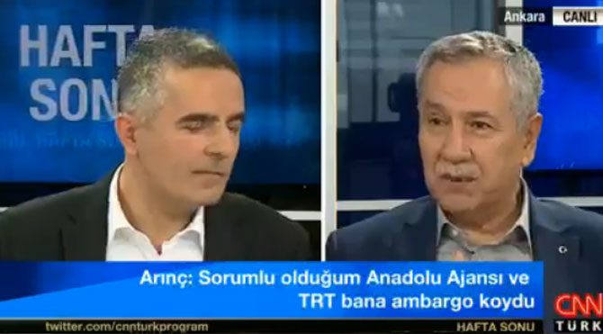 AKP’nin kurucularından Bülent Arınç, Cnn Türk’te Hakan Çelik’in sorularını yanıtladı. Önemli açıklamalarda bulunan Arınç, çok tartışılacak konulara da değindi.Eskiden TRT'den ve Anadolu Ajansı'ndan sorumlu olan eski Başbakan Yardımcısı Arınç, "Parti içinde televizyona çıkmamam için yasaklar konuldu. TRT dahil olmak üzere bazı kanallar bana ambargo koydu. TRT'den ambargoluyum. Bir derdimi ifade etmek zorunda kaldım. Kendi sorumlu olduğum TRT'nin, Anadolu Ajansı'nın bana ambargo koyması üzücüdür. Bütün kanallara bakın, herkes vardır Bülent Arınç yoktur. Bu benim şahsımın kötü oluşundan değil, birilerini rahatsız edeceğimdendir" dedi.