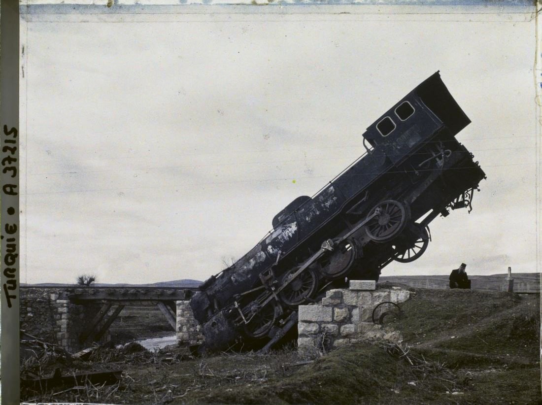 Uşak'ta çekilen bir fotoğrafta düşman güçlerinin lokomotifleri kullanılamaz hale getirdiği görülüyor.