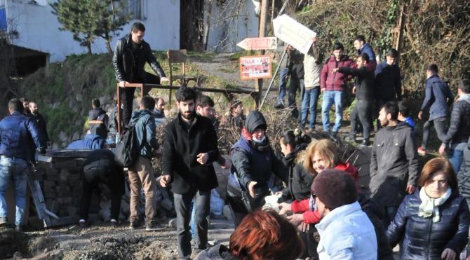 Polisin araçları çekip yolu açarak ilerlemesi üzerine, direniş için bu kez yaklaşık 200 metre yukarıda taş, odun ve çöp tenekeleriyle barikatlar kurdu. Yaklaşık 300 kişilik grup, sabah saatlerinden itibaren `Direne direne kazanacağız` sloganları atarak barikatın arkasında beklemeye başladı.