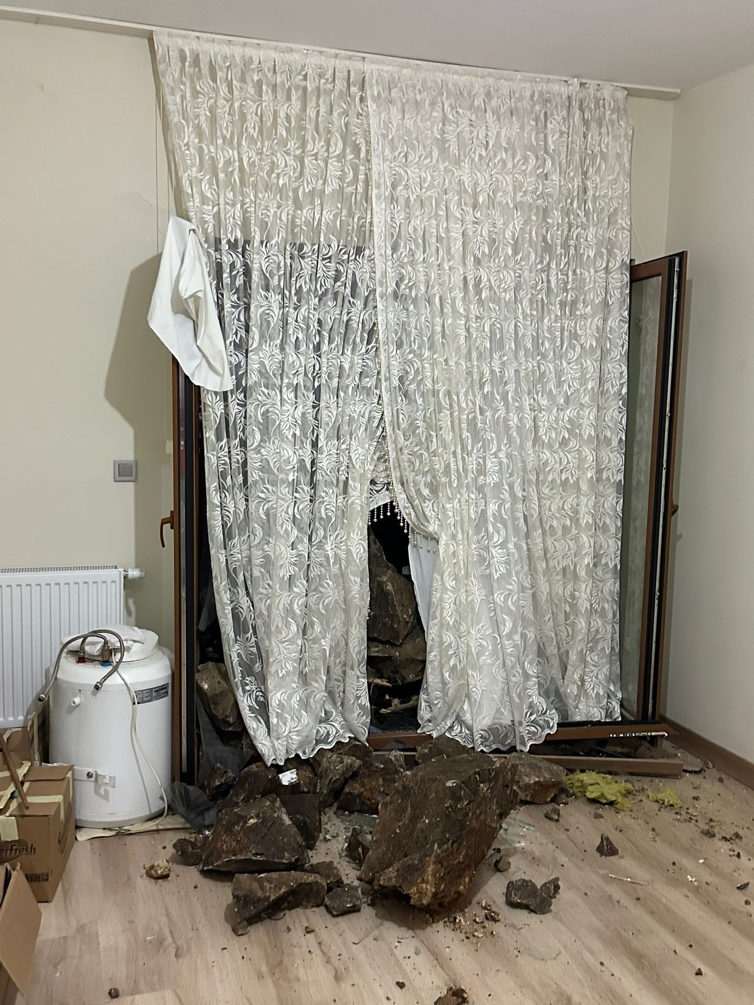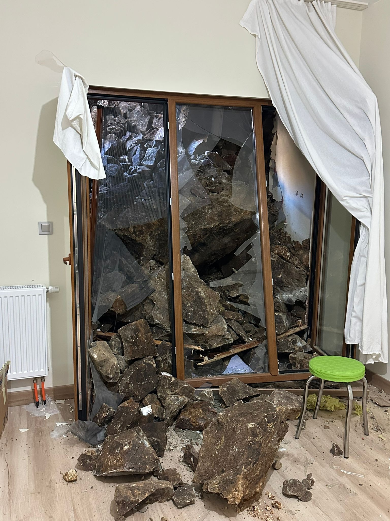Yatak odasını ortasına kadar gelen taş parçaları eve hasar verdi. Heyelana başka bir odada yakalanan aile korkarak, dışarı çıktı.
