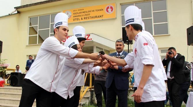 Daha sonra 140 öğrenci 'Aşçılık Yemini' etti. Ardından kepçe demir teslimi yapıldı. Kepçeleri alt sınıftaki arkadaşlarına devir eden öğrenciler, daha sonra hep birlikte aşçı keplerini havaya atarak mezuniyet coşkusu yaşadı. Törenin sonunda katılımcılara Mengen pilavı, et döner ve ayran ikram edildi.