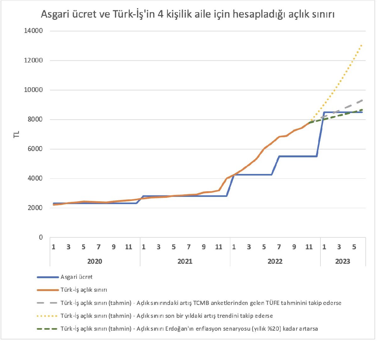 Cumhurbaşkanı Erdoğan'ın yıl sonu yüzde 20 enflasyon senaryosunda asgari ücretin haziran 2023'de açlık sınırının altına ineceği tahmin edilirken Merkez Bankası anketlerindeki tahminlere göre ise asgari ücretin Mart 2023'de açlık sınırının altına inmesi öngörülüyor.