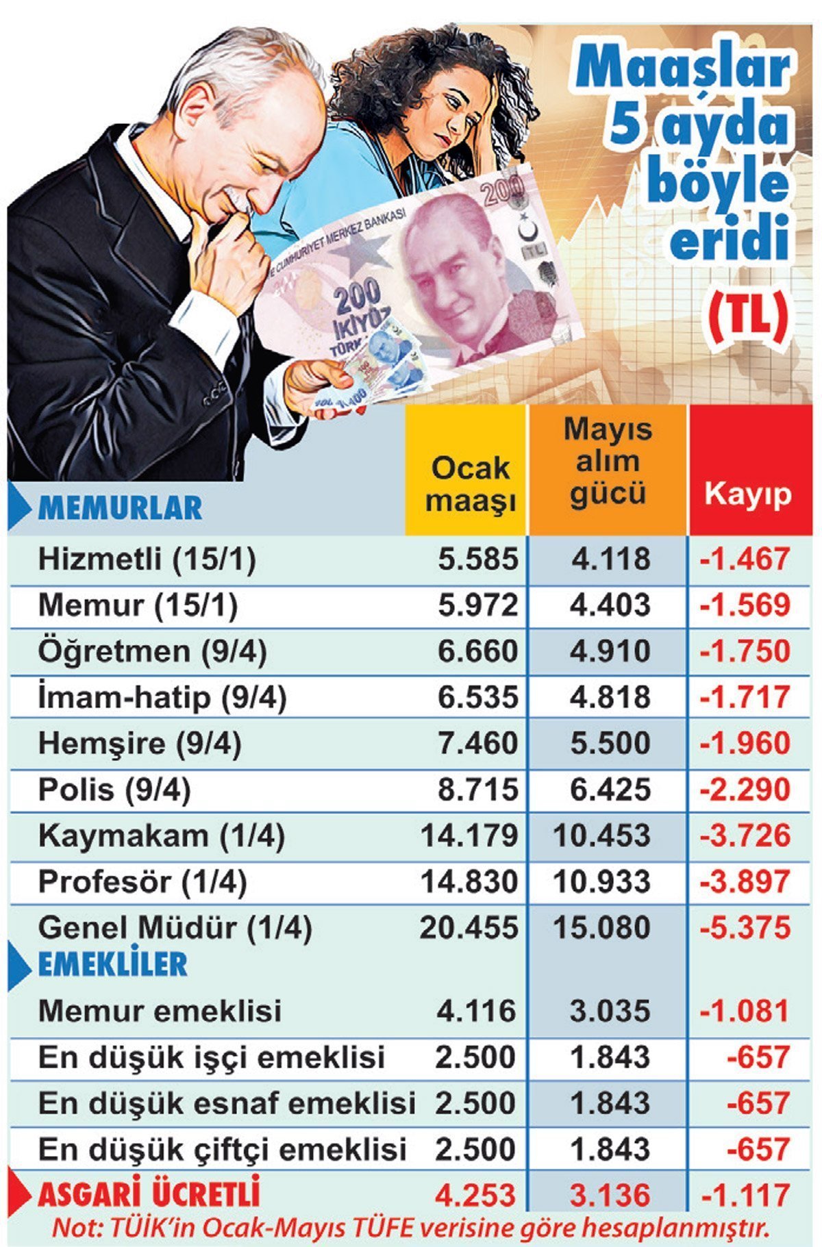 Türkiye İstatistik Kurumu'nun (TÜİK) çarşı pazardaki yangını yansıtmayan hesabıyla bile emekli ve çalışanların maaşı 5 ayda yüzde 35.64 oranında eridi. En düşük memur maaşının alım gücü asgari ücretin altına düştü. Asgari ücretlinin alım gücü 3 bin 136 liraya geriledi. Yılbaşında 5 bin 972 liraya yükseltilen en düşük dereceli memurun alım gücü mayıs sonu itibarıyla TÜİK enflasyonuyla 4 bin 403 liraya düştü, net asgari ücretin altına düşen memur bin 569 lira kaybetti. Maaşı 6 bin 660 lira olan öğretmenin alım gücü 5 ayda 4 bin 910 liraya, 7 bin 460 lira maaş alan hemşirenin alım gücü 5 bin 500 liraya geriledi.