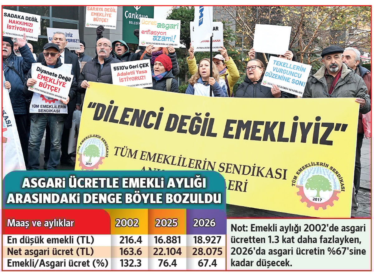 AKP’nin iktidara geldiği 2002 yılında emekli aylığı 216.4 lira, asgari ücret de 163.6 liraydı. Yani en düşük emekli aylığı asgari ücretten yüzde 32.3 daha fazlaydı. Ancak 2026 başında en düşük emekli aylığı 18 bin 927 lira, asgari ücret ise 28 bin 75 lira olacak. Bu durumda en düşük emekli aylığı asgari ücretin yüzde 67.4’üne kadar düşecek. 2002’deki oran aynı şekilde korunmuş olsaydı 2026 itibarıyla en düşük emekli aylığı 37 bin 136 lira olacaktı.