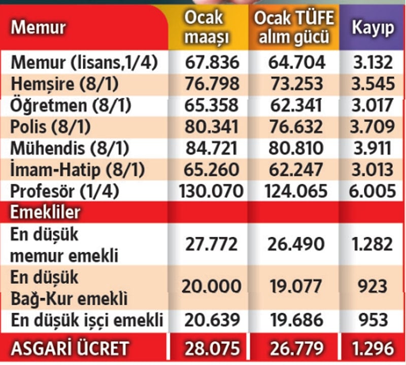 Hizmetli sınıfında çalışan en düşük memur maaşı yıl başında 58 bin 305 lira yapılmıştı. Bu memurun alım gücü TÜİK enflasyonuyla 2 bin 692 lira, ENAG enflasyonuyla 3 bin 466 lira eridi. En düşük devlet memurunun maaşı bir ayda 58 bin 305 liradan 54 bin 839 liraya düştü. Ocakta yaşanan yüksek enflasyon yüzünden öğretmen 3 bin 885 lira, polis 4 bin 776 lira, mühendis 5 bin 36 lira, profesör 7 bin 732 lira kaybetti.