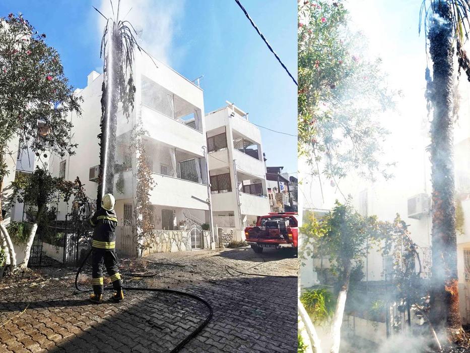 Muğla’nın Bodrum ilçesine bağlı Kumbahçe Mahallesi Zekin Müren Caddesi Seyit Kaptan Sokak’ta öğle saatlerinde meydana gelen olayda evlerin arasındaki palmiye ağacı alev alev yanmaya başladı. Büyük korku ve heyecan ile dışarı çıkan mahalle sakinleri durumu polise ve itfaiye ekiplerine haber verdi.
