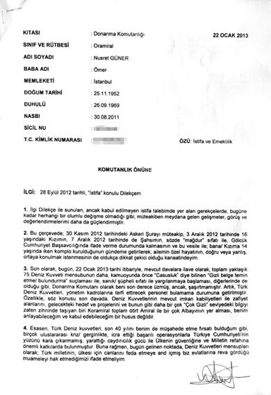 “Deniz Kuvvetleri’ni suç işleyen bir mekanizma olarak gösteren bu durumun tesadüf olmadığını değerlendirdiğimi; komutanlarıma ifade etmenin huzuru; ancak sorumluların çaresiz kalmasının üzüntüsü ile hazırlamış olduğum dilekçe ekte”