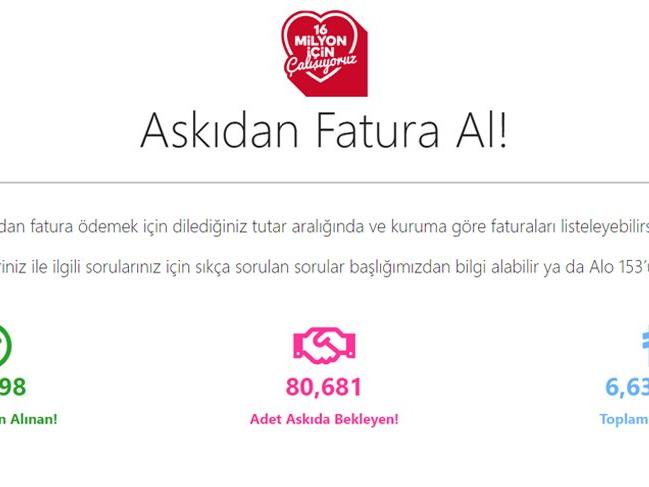 Son olarak 7 Mayıs 12.30 itibarıyla sistemde ödenen fatura sayısı 50 bini aştı ve 52 bin 598'i buldu. Dün açılan ödeme sisteminde şu ana kadar 6 milyon 630 bin 749 TL'lik fatura ödenmiş durumda. Şu an sistemde 80 bin 994 adet fatura da askıda ödenmeyi bekliyor.