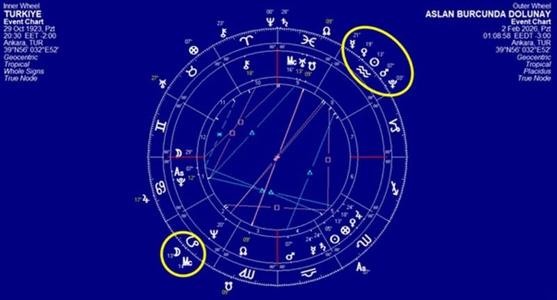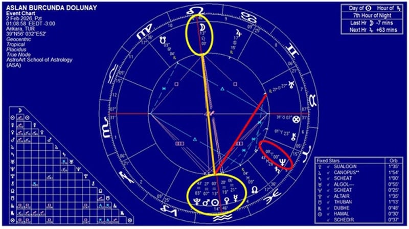 2 Şubat Pazartesi gecesi saat 01:09’da gerçekleşecek Aslan burcundaki dolunay, 2026 yılının en dikkat çeken dolunaylarından bir tanesi. Dünya Astrolojisi türünde Aslan burcu yönetme becerisiyle, yöneticilerle, monarşiyle bağdaştırılır. Aşağıdaki haritada görüldüğü üzere, Ay Tepe Noktasında Aslan burcunda yerleşmekte, içinde bulunduğumuz bölgede liderlerin odak noktasında olacağını göstermektedir. Ay’ın karşısındaki Kova burcunda yerleşen Güneş ve dört gezegen ise, yönetici figürlerinin aldıkları kararlara karşın muhalefetten seslerin yükseleceğini düşündürmektedir. Dünya Astrolojisinde Kova burcu çoğulcu yönetimlerle, demokrasiyle, insan haklarıyla, eşitlik ve adalet temalarıyla, halkların sesiyle ilişkilendirilir. 2 Şubat 2026’da gerçekleşecek Aslan dolunayını takip eden günlerde halkın liderlerin karşısındaki onaylamayan duruşunu, protestoları görmeye başlayabiliriz.